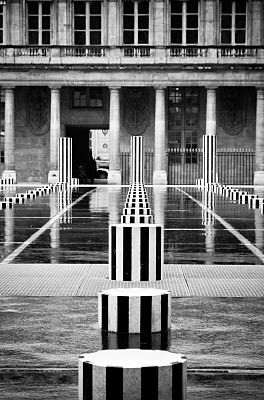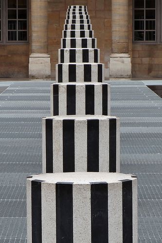 The Colonnes de Buren or Les Deux Plateaux is an art installation by Daniel Buren in the Palais Royal in Paris. While the design itself consists of striped white and black columns emerging from the floor, it was supposed to inspire a reflexion on perception and projection of space.