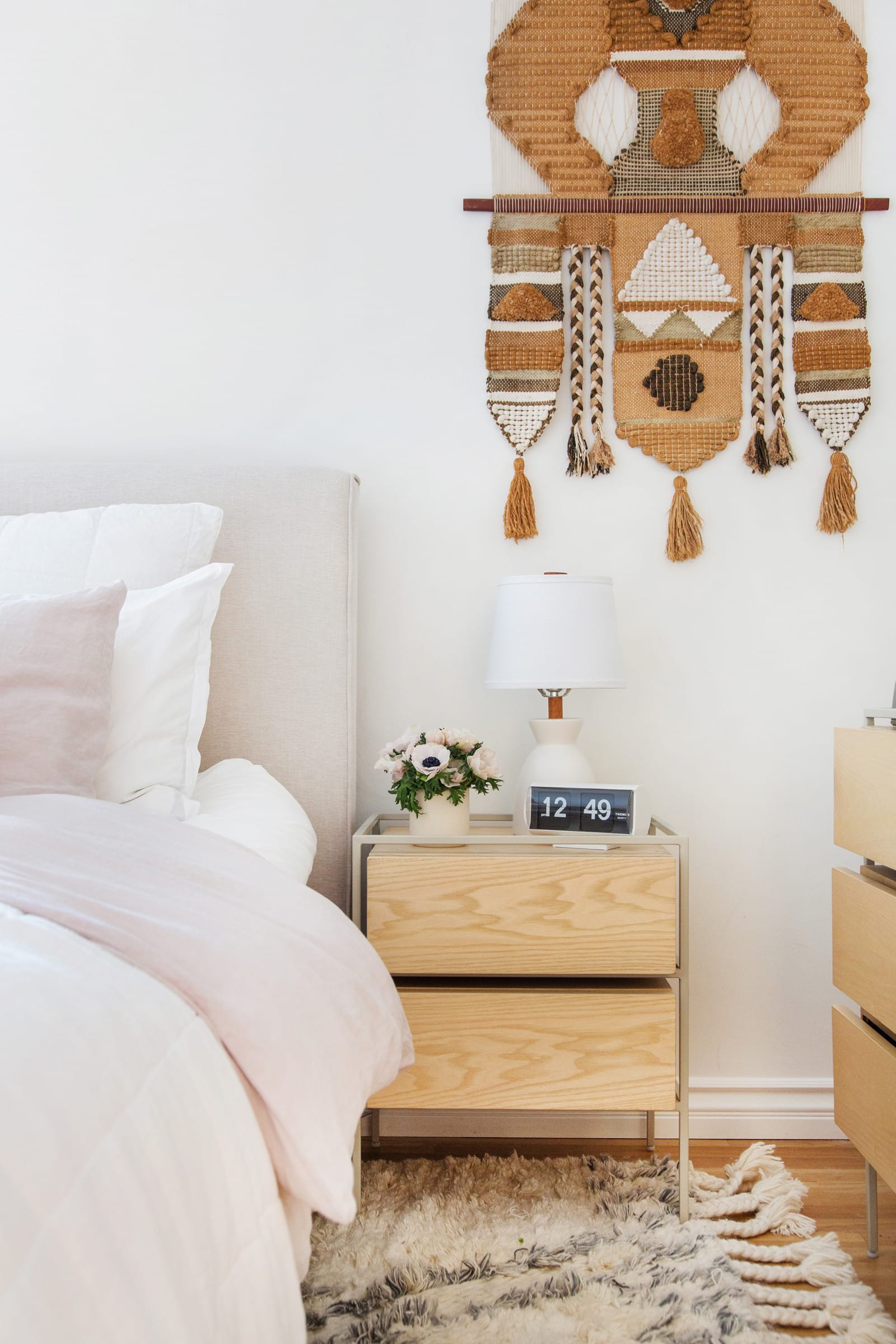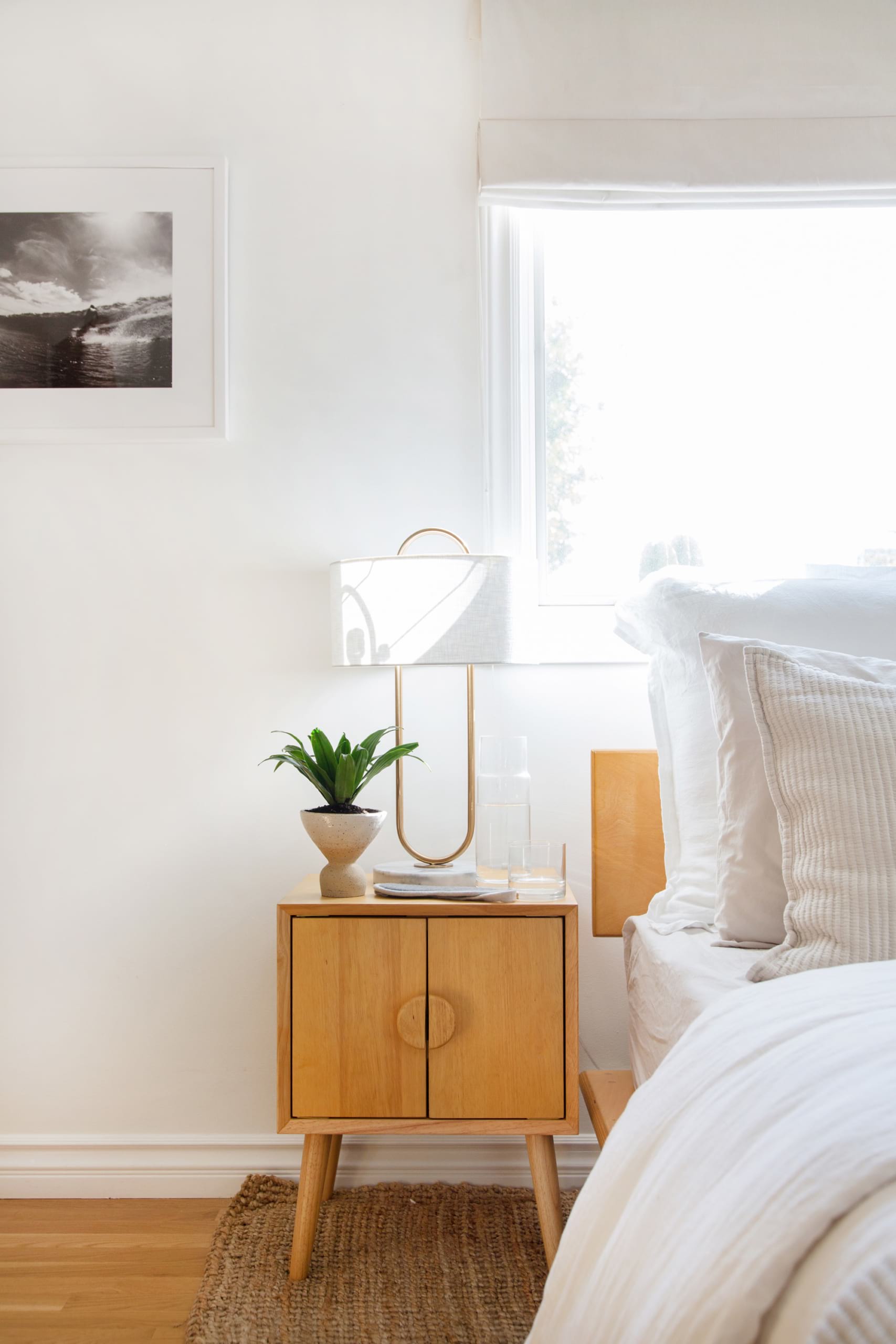 Notice how these two bedroom corners both use white as the background color, but vary slightly in the details. While light-filled, white interiors are a major feature of West Coast Interior Design, the first one is rather more eclectic. In contrast, the second bedroom is almost minimalist, with only the mid-century table lamp and the organic rug to give it some personal charm.