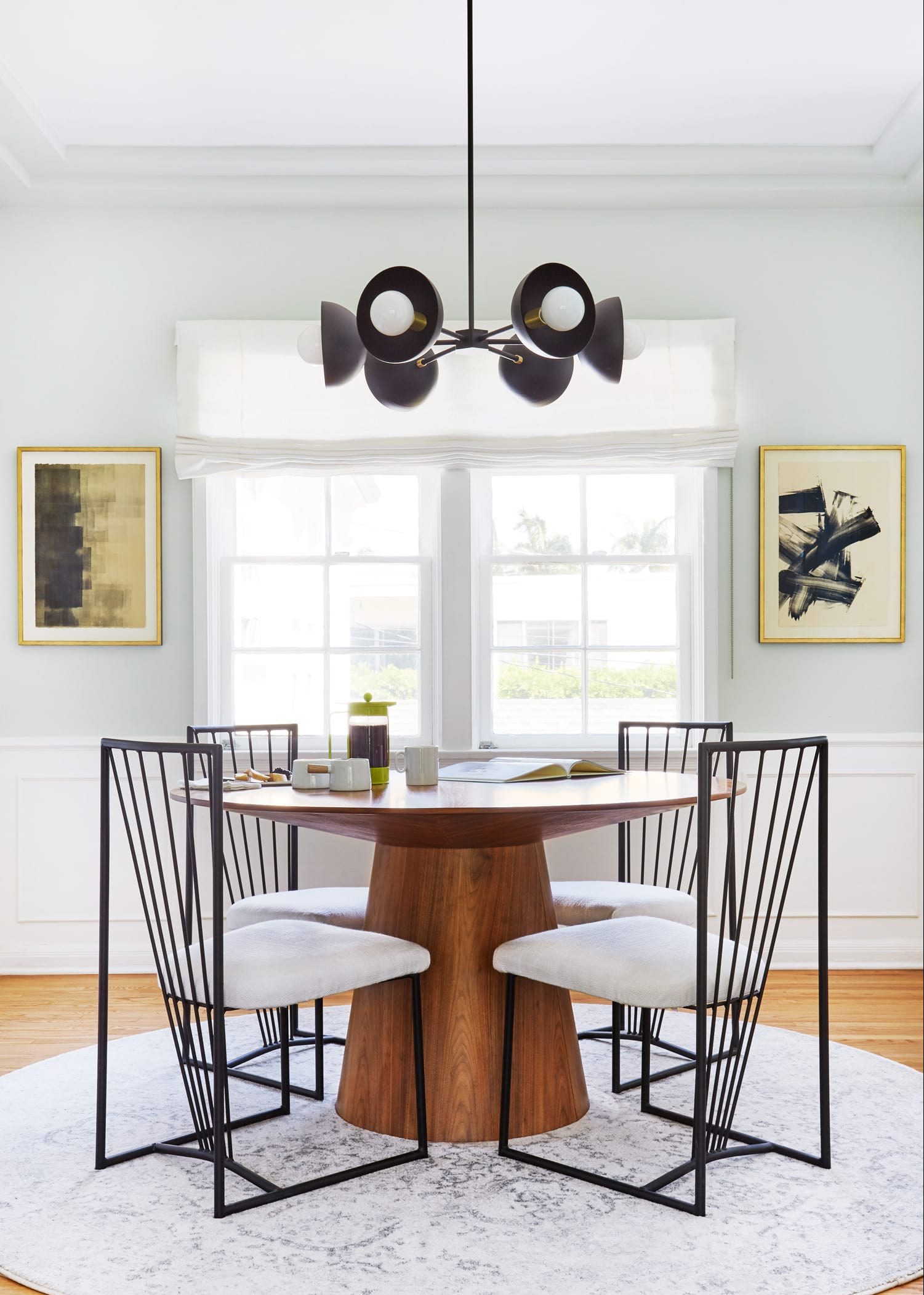 Finally, we would like to show you some of Orlando’s dining rooms. This first project is rather reminiscent of what we’ve seen in his living room decor. Bold lighting and unique art in luminous white interiors. It’s the Orlando Soria trademark!
