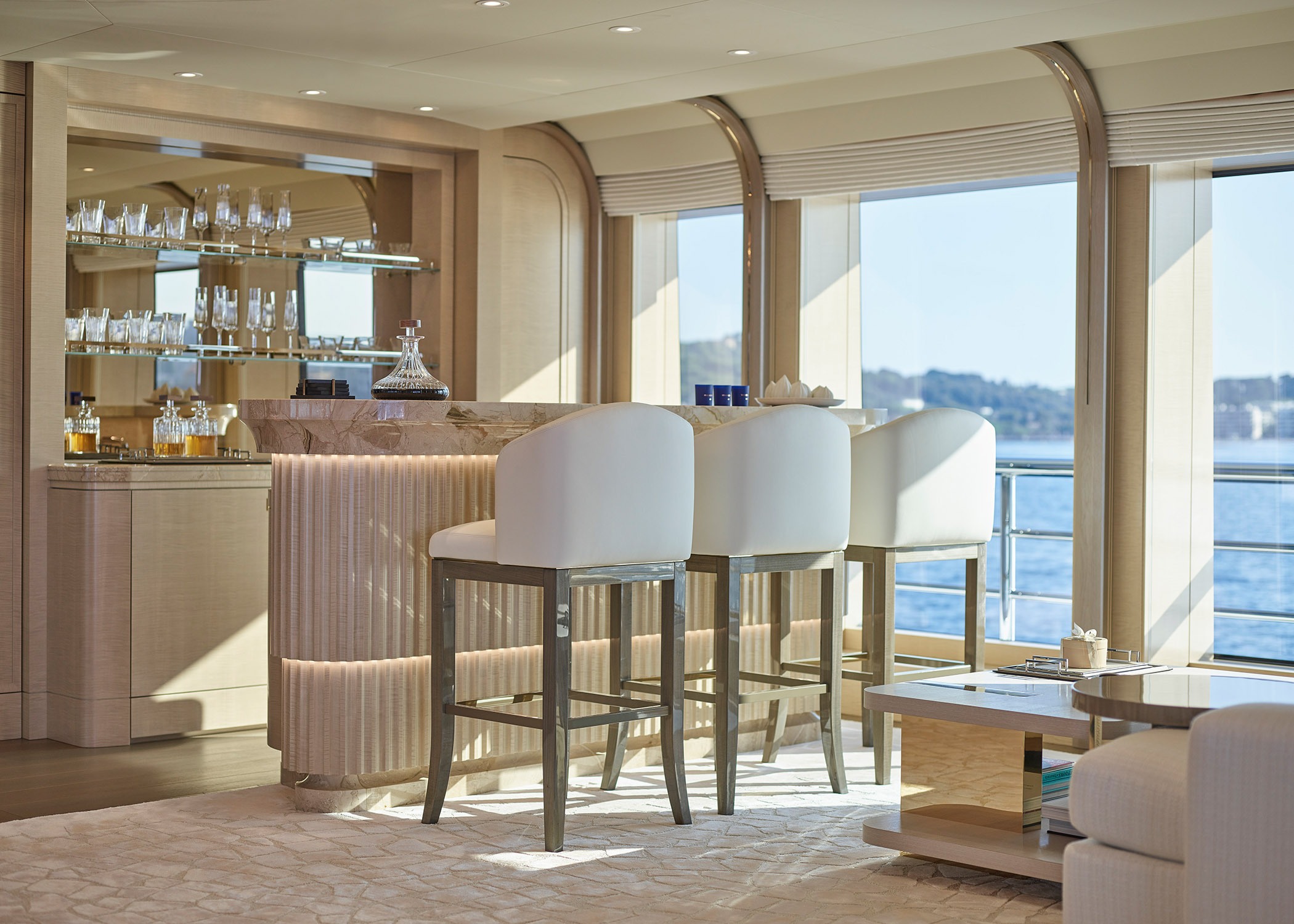 But there’s much more to admire. How do you like the lovely art deco bar? The lines themselves almost remind you of corals and shells. And the airy, light decor is just as present in the dining and living areas. While just as luxurious, this interior is much different from the Brigadoon’s.