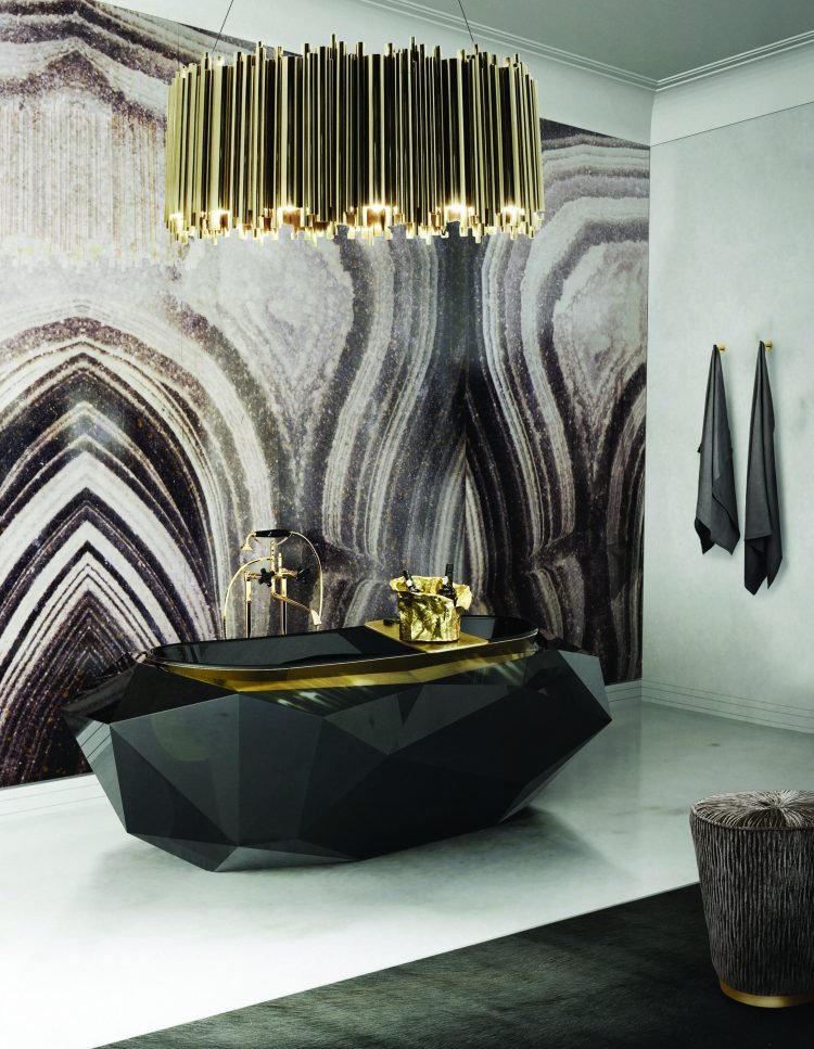 On colors choices, the best options, most common for luxurious bathrooms are white background with gold and black decor, black background with gold decor, white with metallic shades of decor and so on. These choices can be further combined with several materials, enriching the decor and the bathroom design itself.