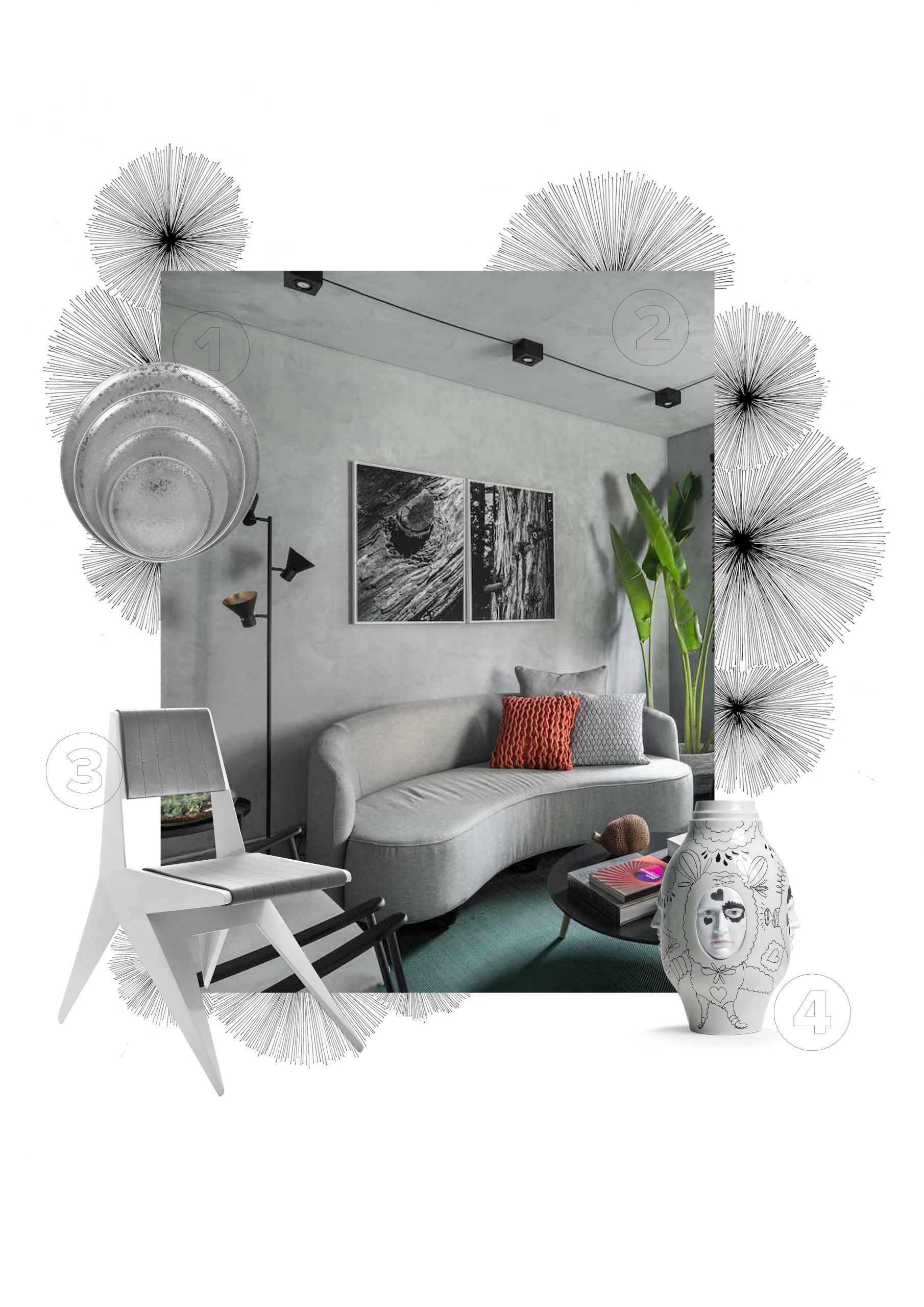 Moodboard by Trendbook; Products (from the left): 1. Kartell FL/Y Suspension Lamp, 2.LOLA by Rug’Society 3. Park Avenue Prewar Apartment by Michael K. Chen Architecture 4. Nº1 Blue Cushion by Home’Society | 1. Stanley Suspension by Delightfull 2. Elie Saab SS20 3. Graphic Collection by Delightfull 4. Inca Armchair by Brabbu