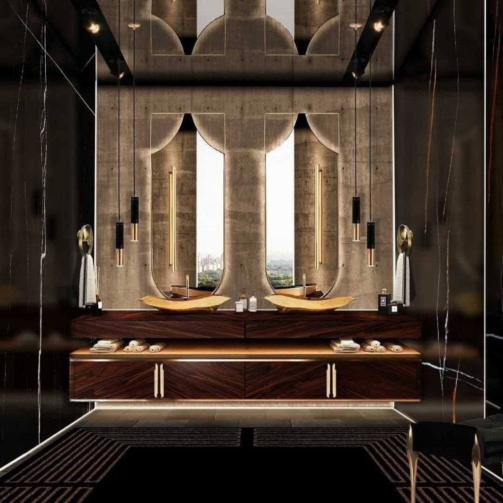 The wall´s dark tones help to highlight the golden pieces, and the mirrors are just from another world!