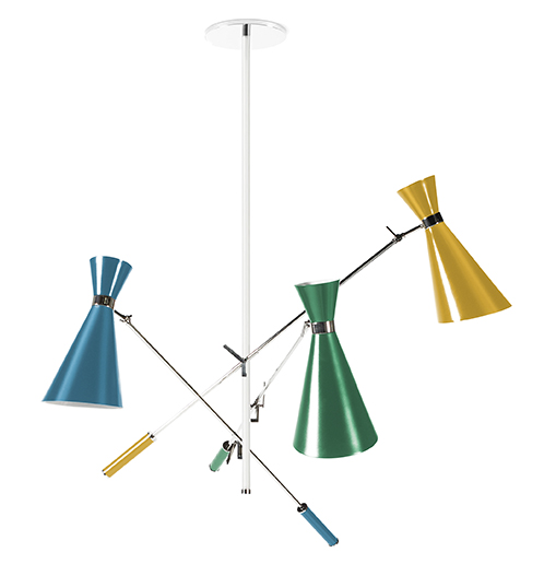 Velvet mid-century bar chairs are placed underneath a stunning collection of lighting pendants that fall from the sky evenly, creating a functional linear image. Storage is provided in modern glass shelves that fill up the back wall.