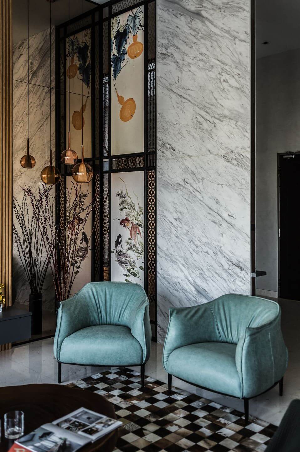 In fact, you can see this cultural influence all over the Opulent 30 Project. There is an influential and wealthy Chinese minority in Malaysia, and this interior is full of Chinese-inspired patterns and decor pieces. Indeed, from the jade tones of the bathroom door to the delicate patterns on the wall and bamboo benches, everything about this project is about taking Chinese culture and making it luxurious.