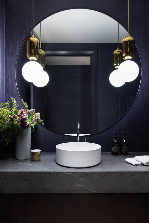 The kitchen is another sensation. While the majestic blue is the first thing one notices about the room, it’s the details that truly make it interesting. For example, the bell-jar shaped lamps or the bubble chandelier. Once again, the sparse use of flowers is used to add personality to the room without overwhelming it.