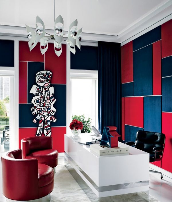 This project for Tommy Hilfiger Home Design is another story. The  red and blue are such vibrant colors for the walls, making the room stand out immediately and turning it into aappealing space to work in. The contrast of marble floors, white table and lighting suspension, with the exotic colored wall decoration, is brilliantly done.