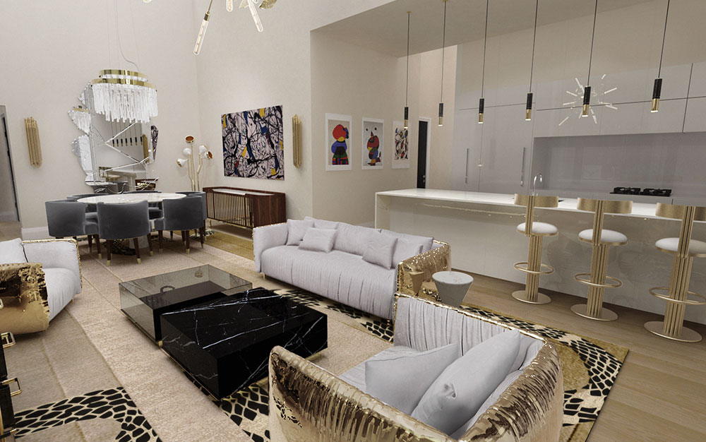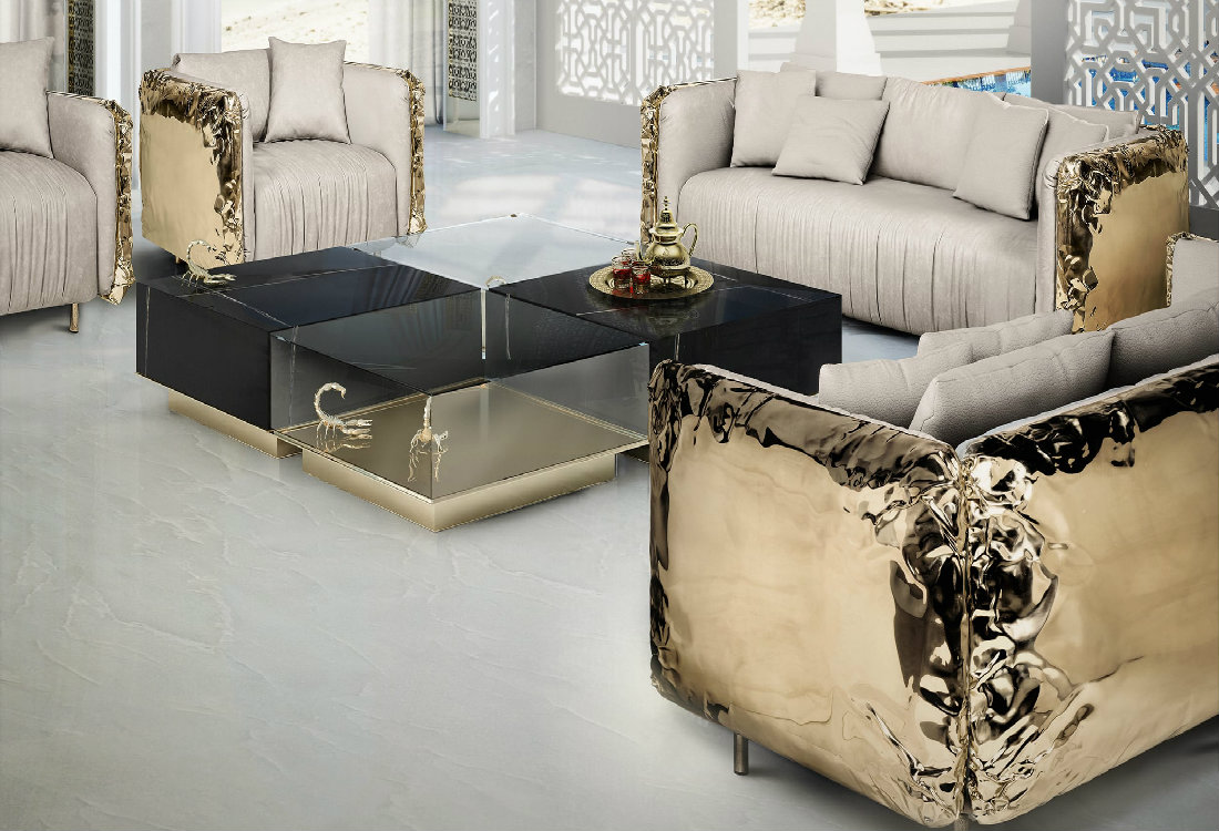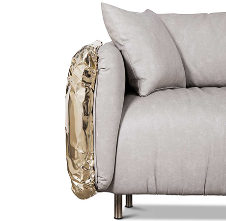 Living Room Inspirations with Metallic ShimmersThe Imperfecto Sofa is a unique piece made by Boca do Lobo, which give the impression of shiny neutrals. The way the irregular flawed surface of manual hammered brass transpires the idea of imperfection. However, that compromises neither its comfort.